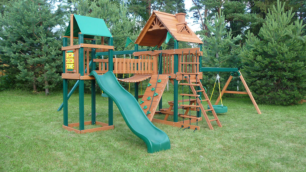 Большой спортивно-игровой комплекс из дерева GORILLA (PLAYNATION) «ГУЛЛИВЕР» состоит из двух фортов с переходным мостиком между ними, двух перекладин для качелей и горки. Дерево пропитано экологичным защитным составом от гниения и насекомых.