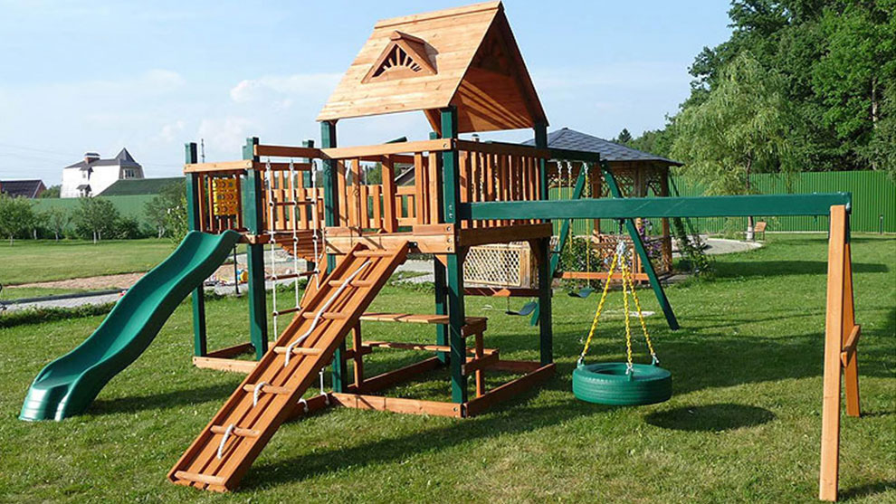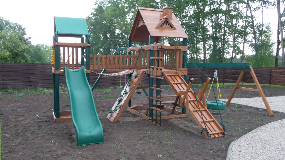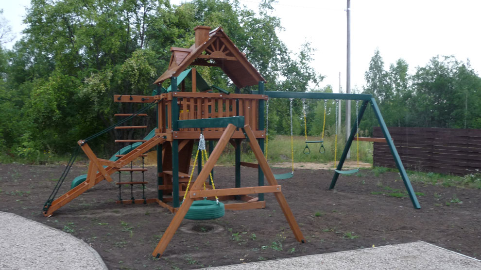 — пара стандартных пластиковых качелей на цепях, покрытых пластиковой оболочкой;