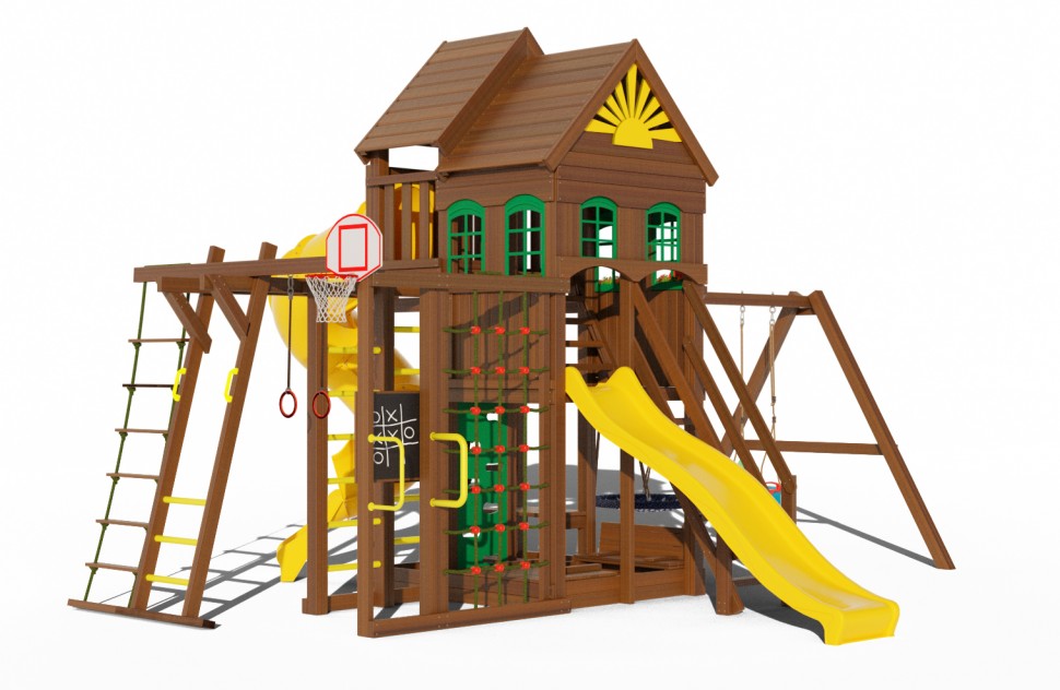 Купить детскую площадку Клуб Сайгон 5 – решить вопрос с потребностями в играх и развлечениях детей на долгие годы. Здесь есть все, что только можно вообразить. Закрытый домик с окошками и цветочницами позволяет играть в любое время года, несмотря на осадки, разнообразные веревочные и шведские стенки – лучший способ слить энергию, две горки, в том числе «Труба», решают вопрос конкуренции. Для самых маленьких – безопасные качели и лавочка со столиком, предназначенные для комфортных игр на свежем воздухе. Конструкция продумана до мелочей и безопасна. Карельская сосна 1 сорта устойчива к смене погодных явлений, не гниет и не рассыхается со временем.