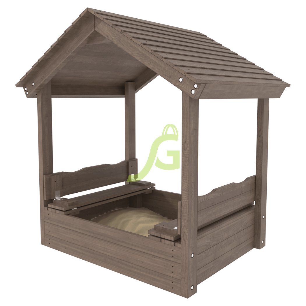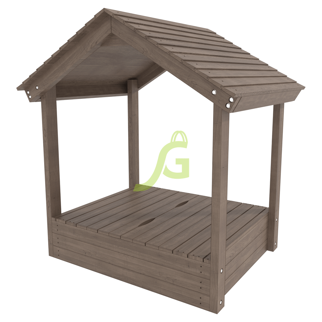 Детская игровая песочница с крышкой и деревянной крышей.