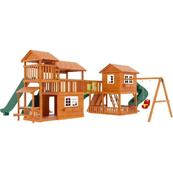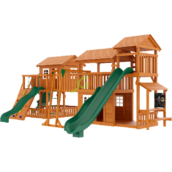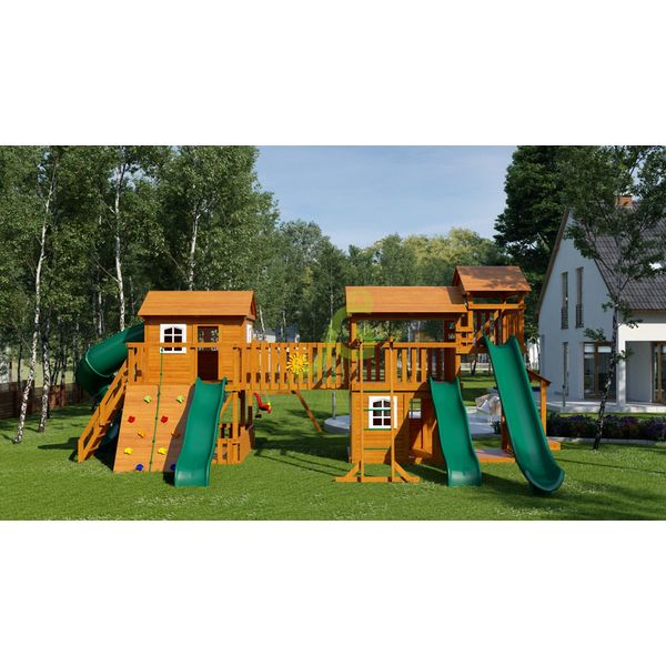 Просто огромный комплекс для детей красиво впишется в ландшафт загородного дома, его стильные башенки с белыми окошками на фоне сочной зелени украсят ваш сад. А самое главное, множество развлечений надолго отвлекут детей от вредных гаджетов, позволят выманить малышей-домоседов на свежий воздух. Разнообразные спортивные снаряды гарантированно будут воздействовать на все группы мышц мальчишек и девчонок. Ведь в площадке есть рукоход, скалодром, канат, лестницы и 4 горки для самых отважных. А для романтичных принцесс и творческих натур предусмотрены разного вида качели, доска для рисования, игра «крести-нолики» и игровой прилавок.