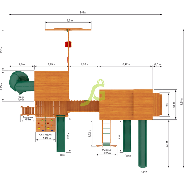 Обращаем Ваше внимание, что цвет установленной детской площадки может отличаться от представленных изображений на сайте. Специфика окраски нетоксичными пропитками допускает отклонения в цветовой гамме отгружаемых изделий вследствие различного цвета натурального природного сырья и естественных компонентов, используемых для производства площадок.