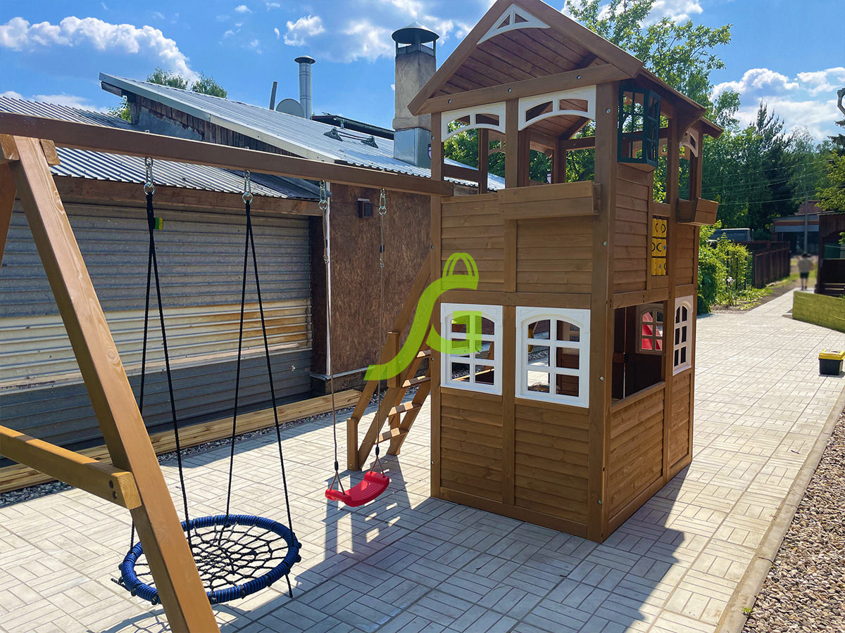 - — Закрытый двухуровневый игровой домик с дверью, деревянной крышей;