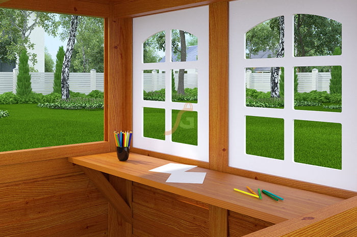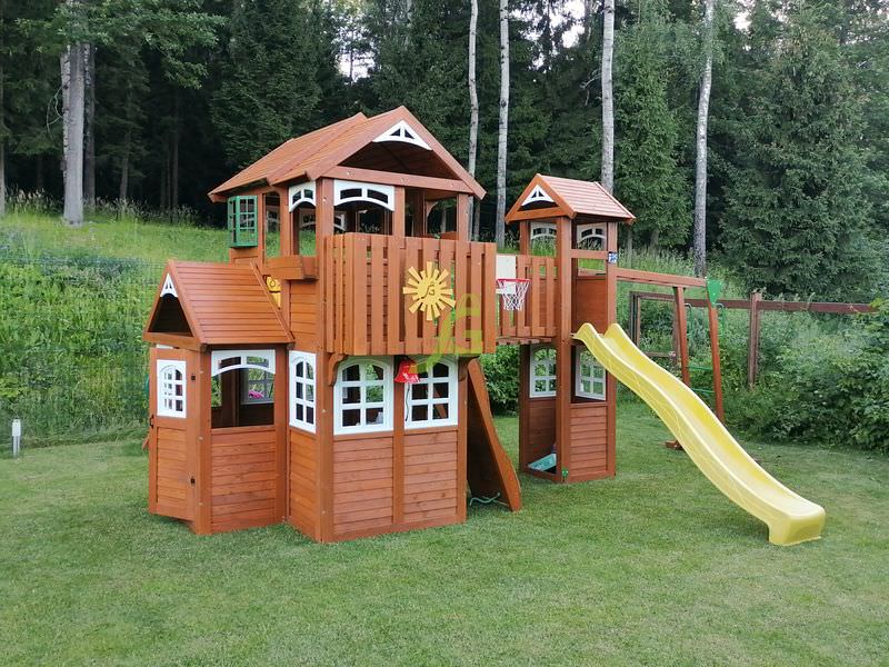 • — Закрытый двухуровневый игровой домик с дверью и деревянной крышей;