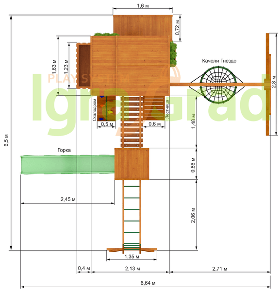 Обращаем Ваше внимание, что цвет установленной детской площадки может отличаться от представленных изображений на сайте. Специфика окраски нетоксичными пропитками допускает отклонения в цветовой гамме отгружаемых изделий вследствие различного цвета натурального природного сырья и естественных компонентов, используемых для производства площадок.