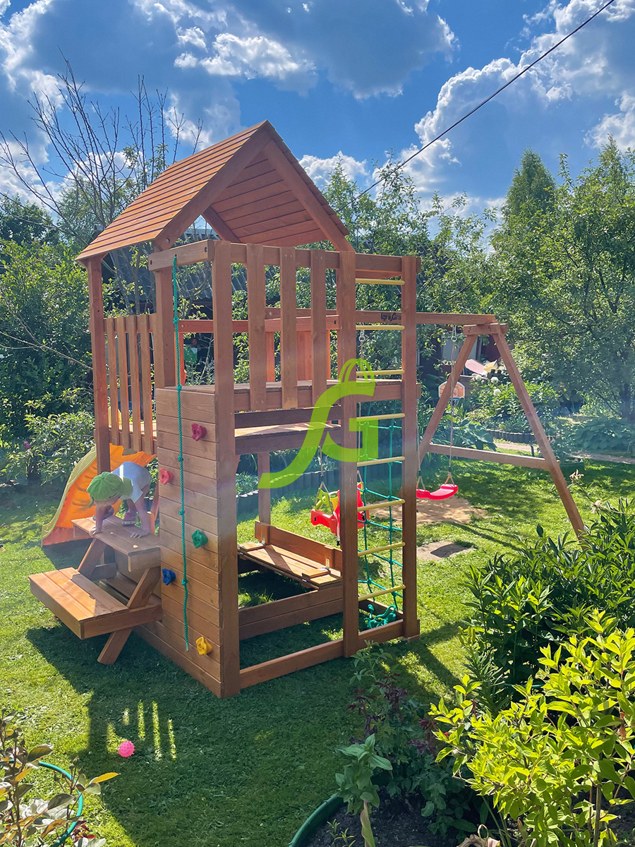 Детская площадка изготовлена из износостойкой древесины, а для её обработки использовалась нетоксичная пропитка на водной основе, что обеспечивает: