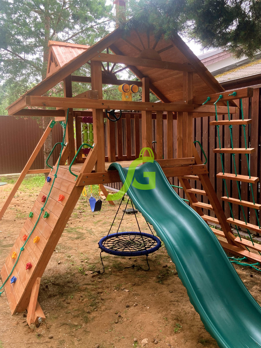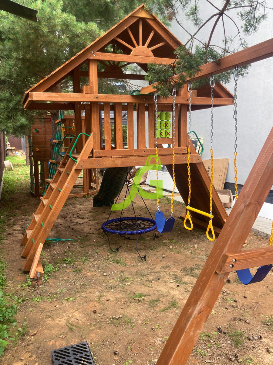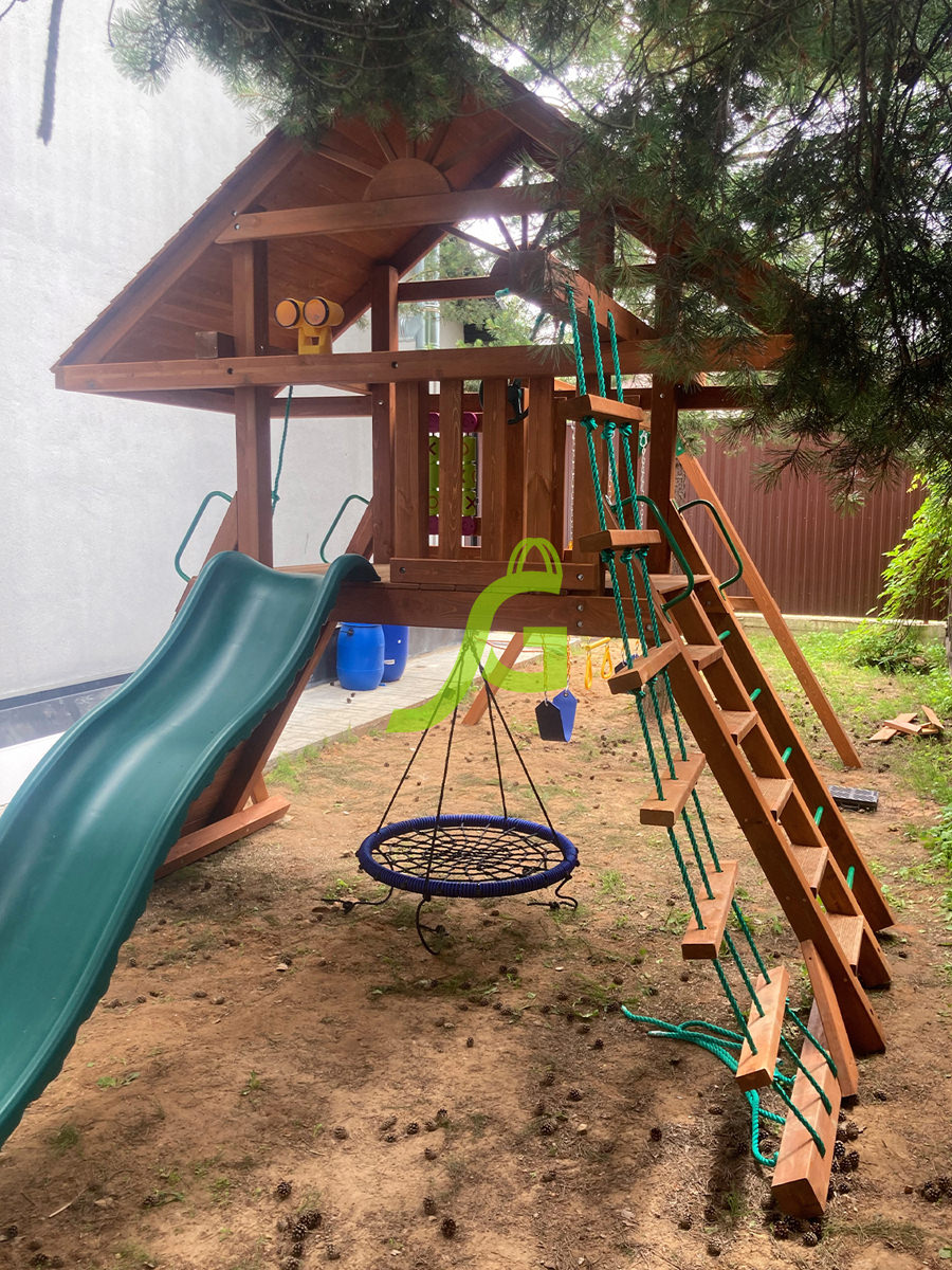 Обращаем Ваше внимание, что цвет установленной детской площадки может отличаться от представленных изображений на сайте. Специфика окраски нетоксичными пропитками допускает отклонения в цветовой гамме отгружаемых изделий вследствие различного цвета натурального природного сырья и естественных компонентов, используемых для производства площадок.