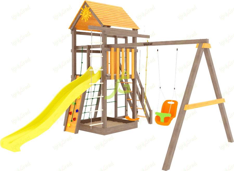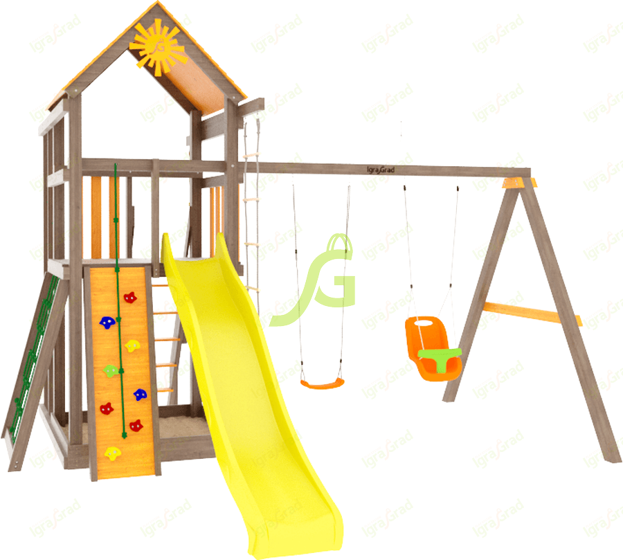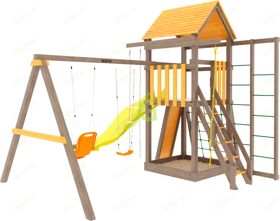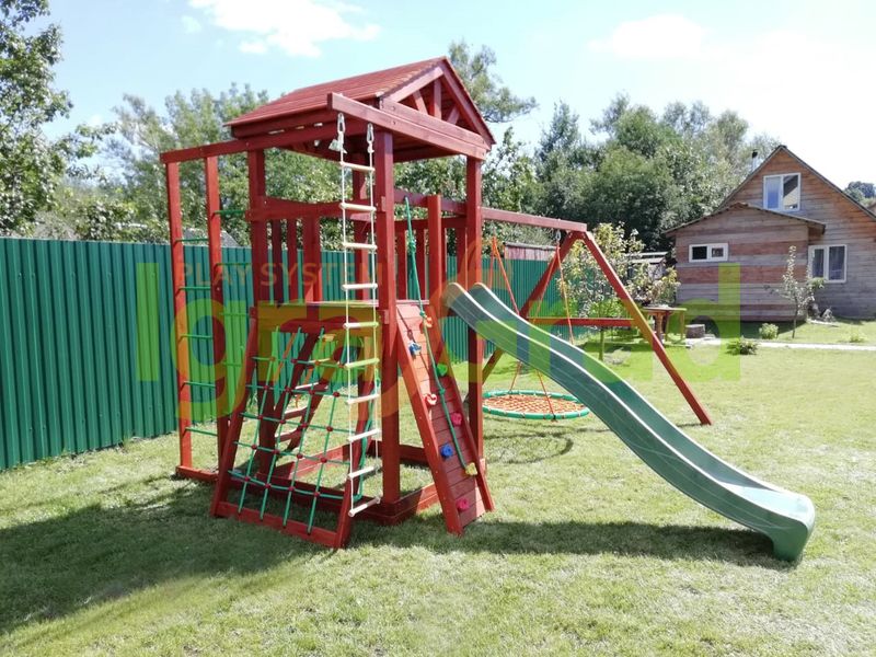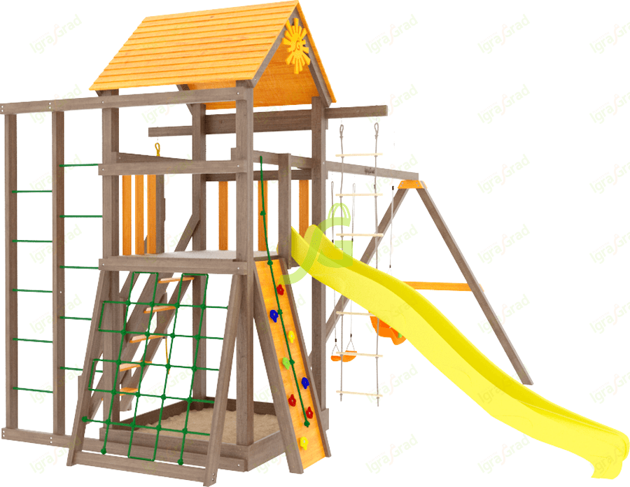 В данной модели собраны элементы для активны игр на свежем воздухе. Волновая горка, навесная лестница, сетка, по которой можно взобраться на второй уровень, турники и качели – ваш ребёнок будет в восторге и обязательно захочет пригласить друзей для ещё большего веселья.