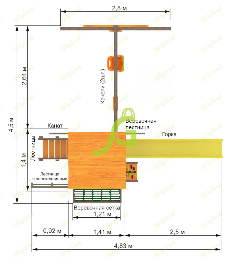 Обращаем Ваше внимание, что цвет установленной детской площадки может отличаться от представленных изображений на сайте. Специфика окраски нетоксичными пропитками допускает отклонения в цветовой гамме отгружаемых изделий вследствие различного цвета натурального природного сырья и естественных компонентов, используемых для производства площадок.
