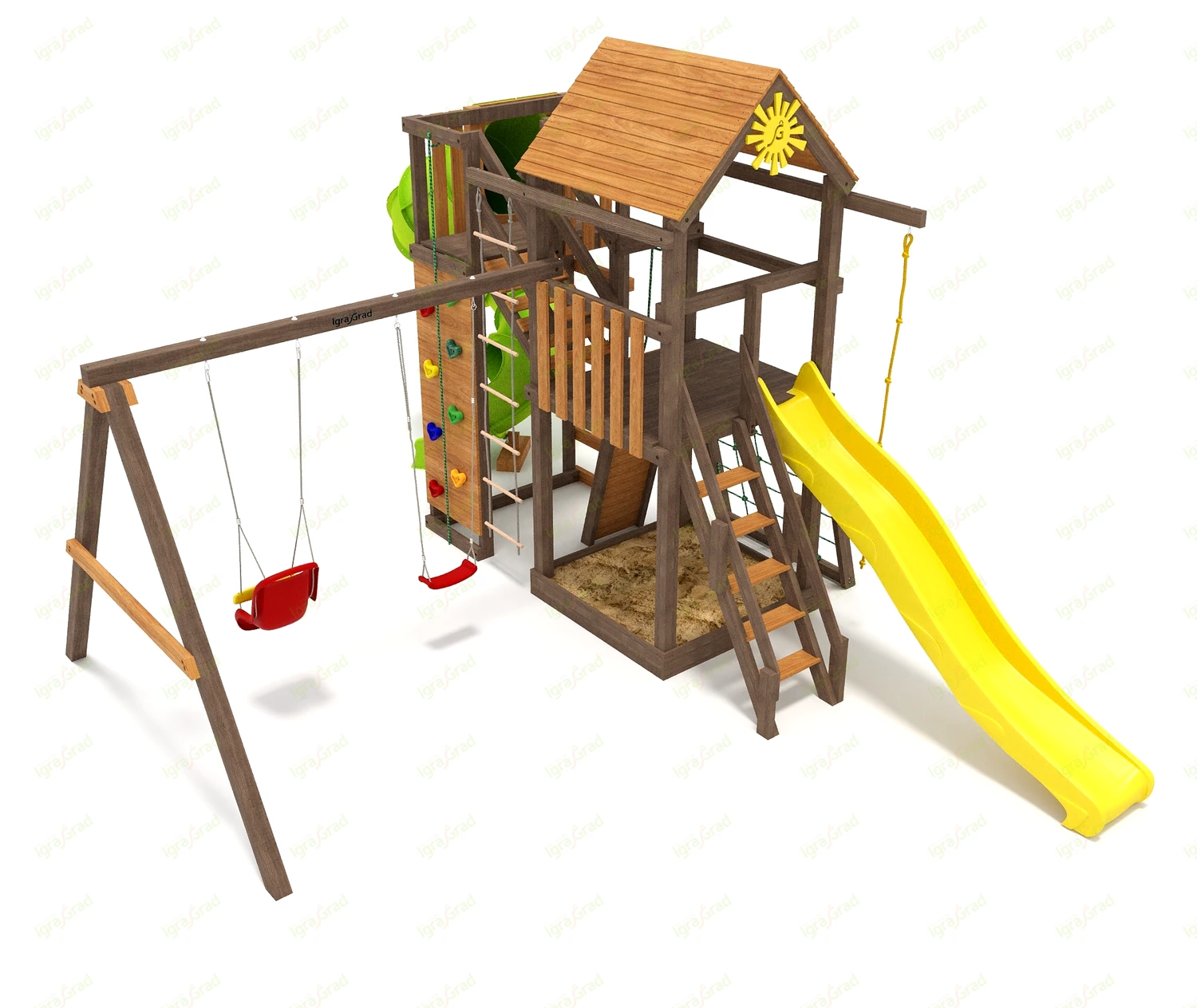 Обращаем Ваше внимание, что цвет установленной детской площадки может отличаться от представленных изображений на сайте. Специфика окраски нетоксичными пропитками допускает отклонения в цветовой гамме отгружаемых изделий вследствие различного цвета натурального природного сырья и естественных компонентов, используемых для производства площадок.