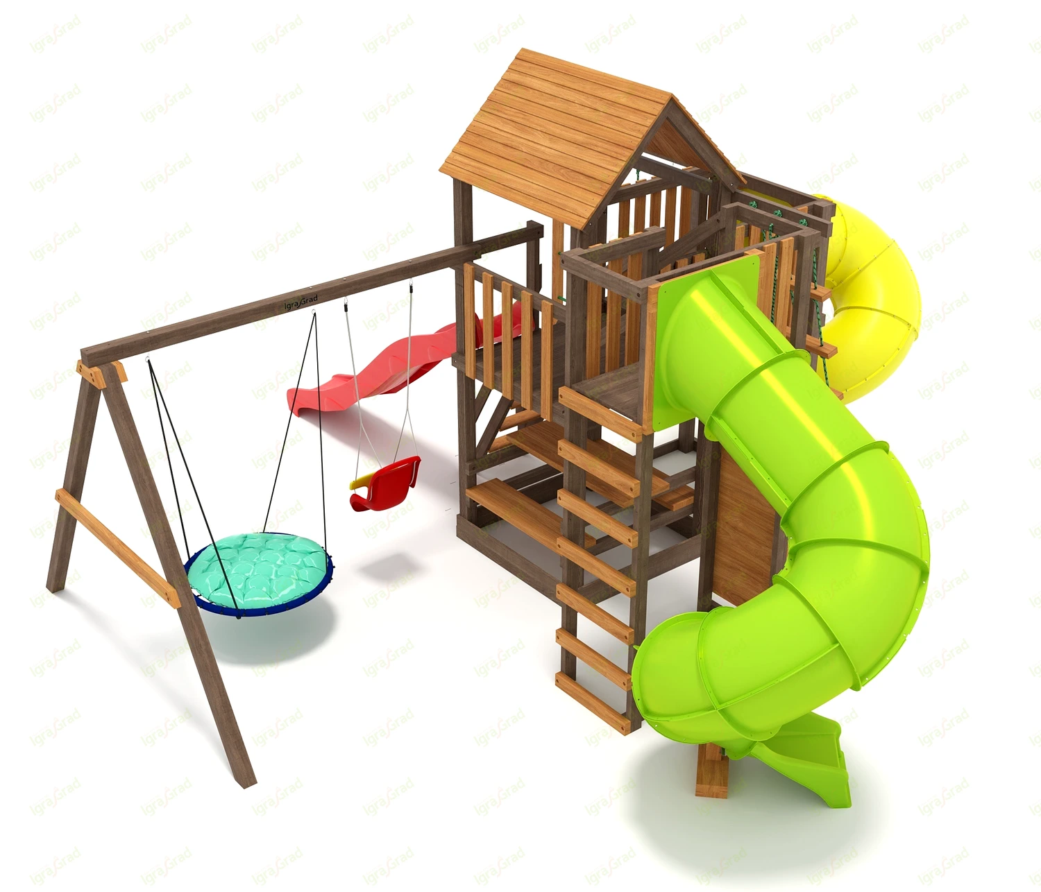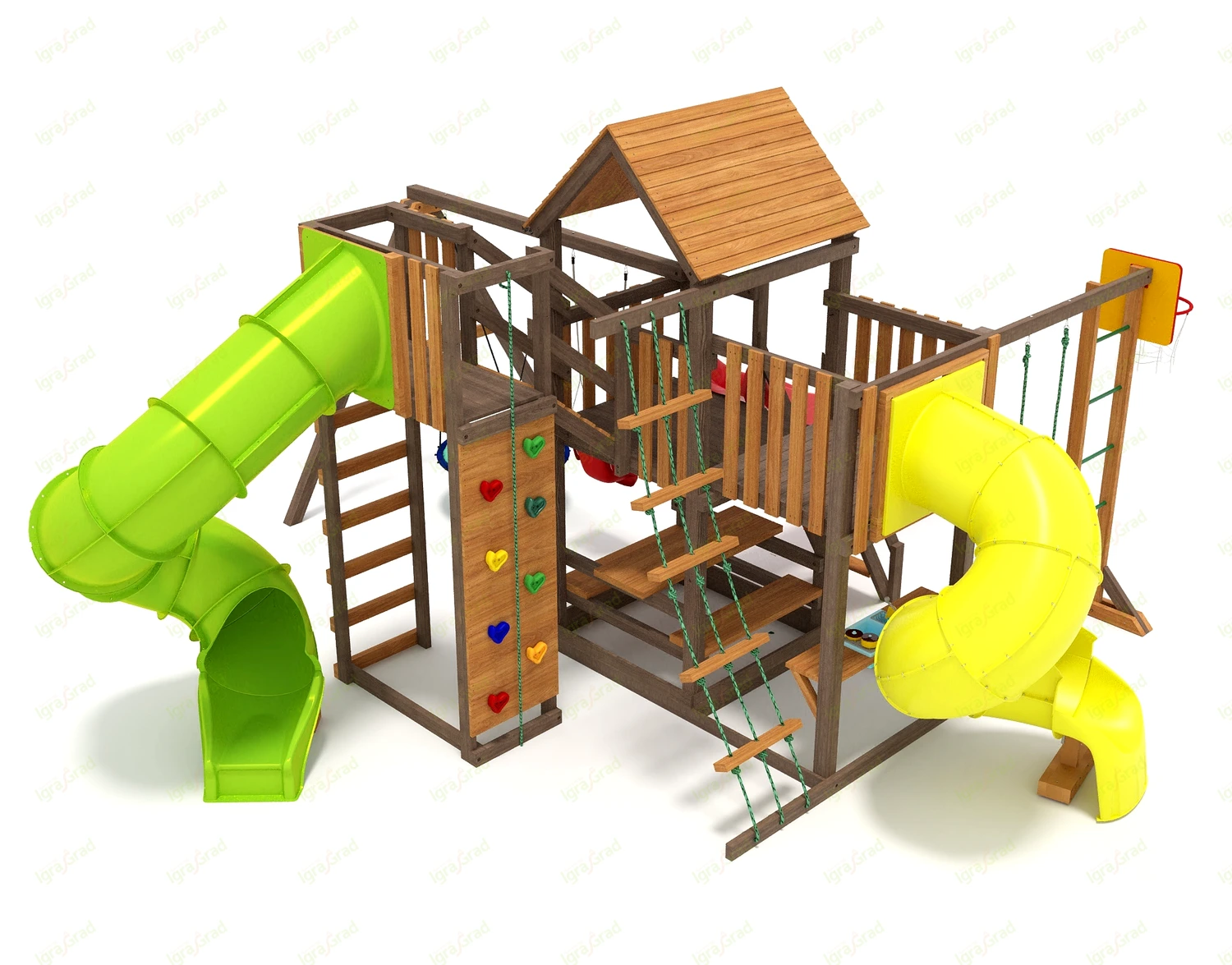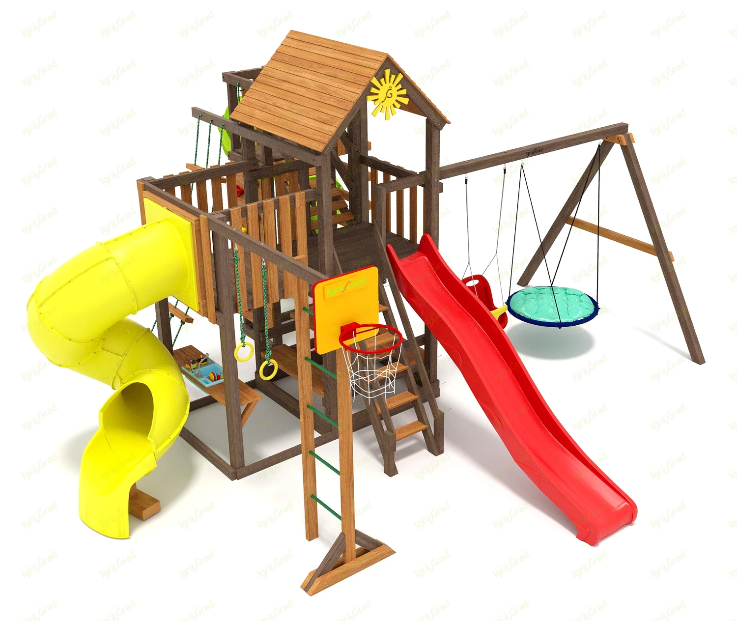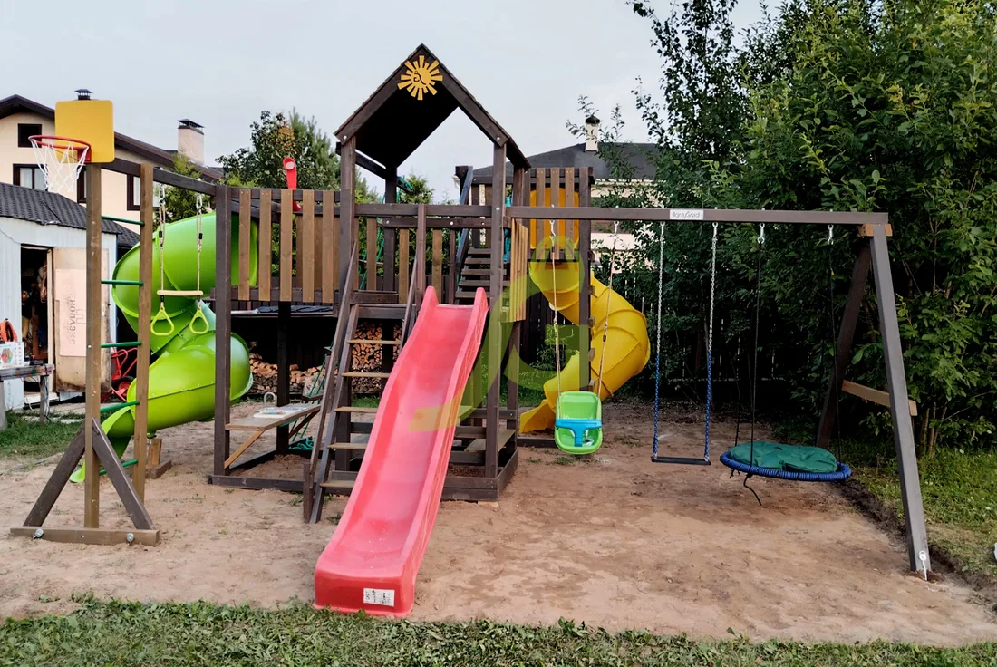 Обращаем Ваше внимание, что цвет установленной детской площадки может отличаться от представленных изображений на сайте. Специфика окраски нетоксичными пропитками допускает отклонения в цветовой гамме отгружаемых изделий вследствие различного цвета натурального природного сырья и естественных компонентов, используемых для производства площадок.