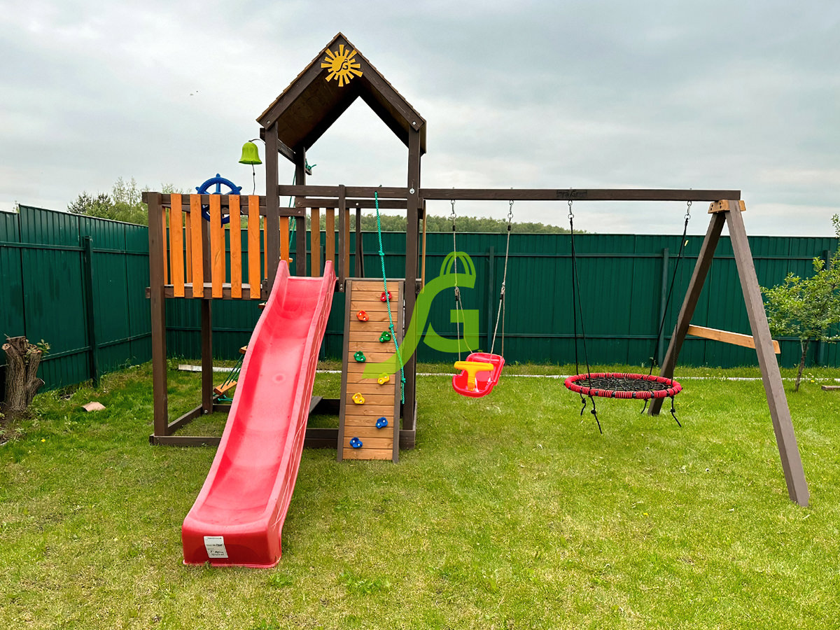 Обращаем Ваше внимание, что цвет установленной детской площадки может отличаться от представленных изображений на сайте. Специфика окраски нетоксичными пропитками допускает отклонения в цветовой гамме отгружаемых изделий вследствие различного цвета натурального природного сырья и естественных компонентов, используемых для производства площадок.