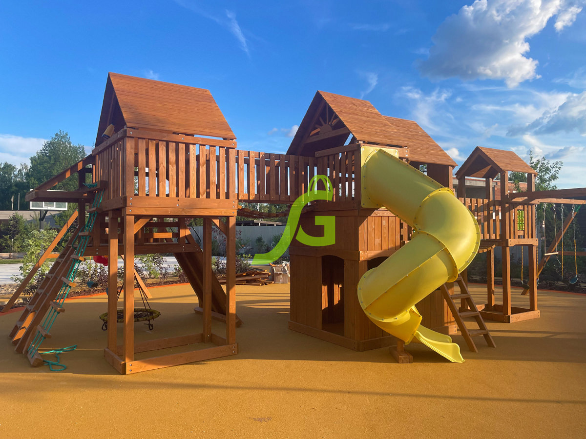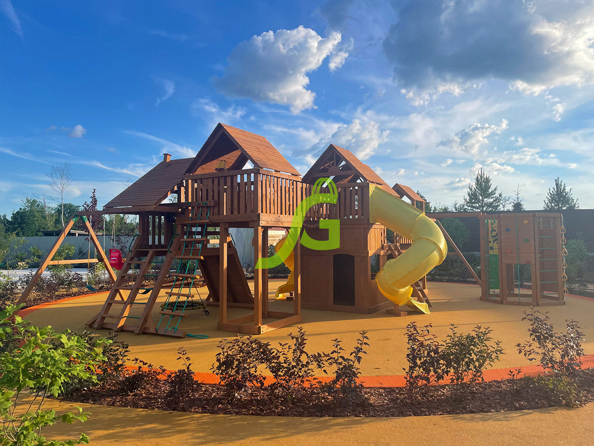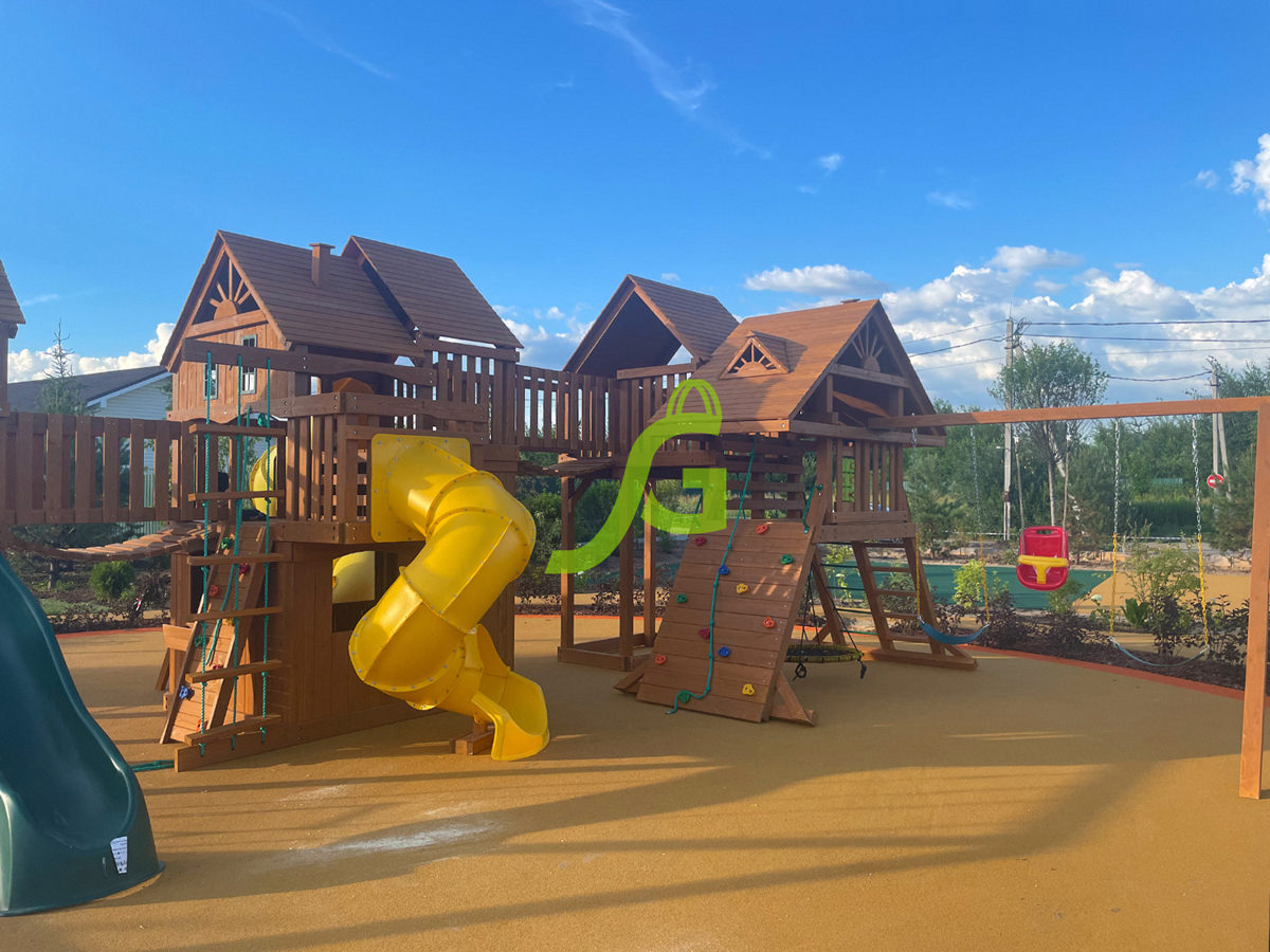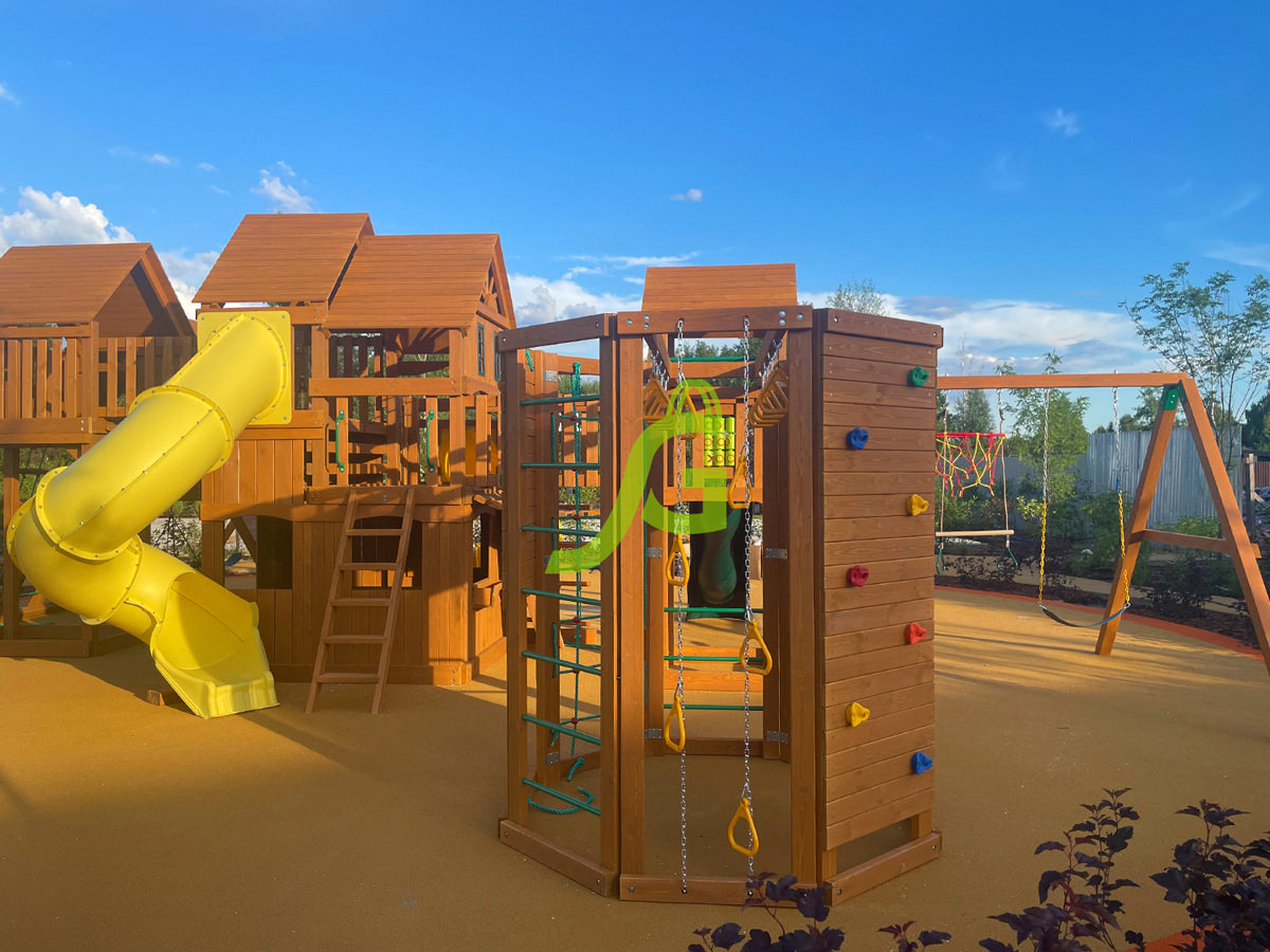 • — Основным материалом сооружения служит натуральная древесина. Уникальные качества не позволяют дереву нагреваться на солнце, а его состав отличается 100 % экологичностью. Для обработки материалов используются нетоксичные вещества на водной основе, поэтому здоровье детей будет в безопасности.