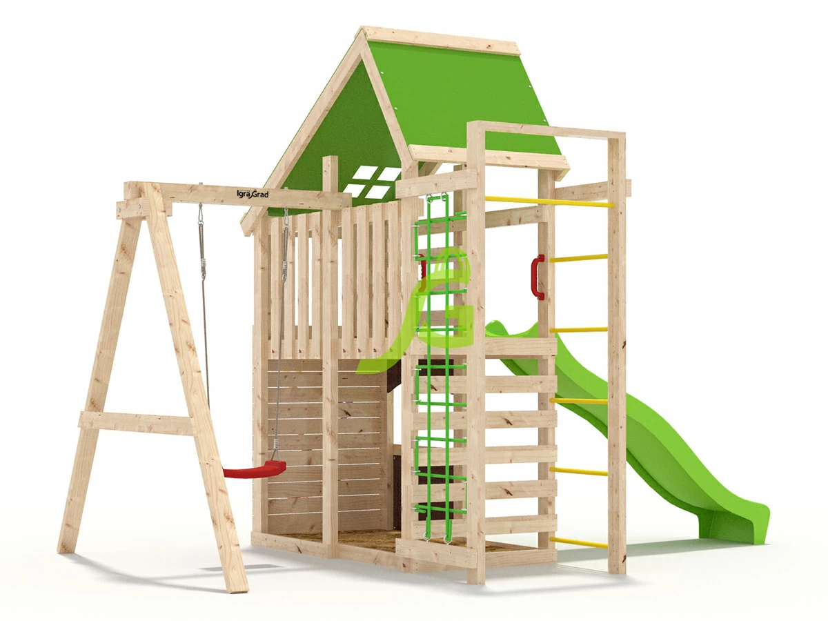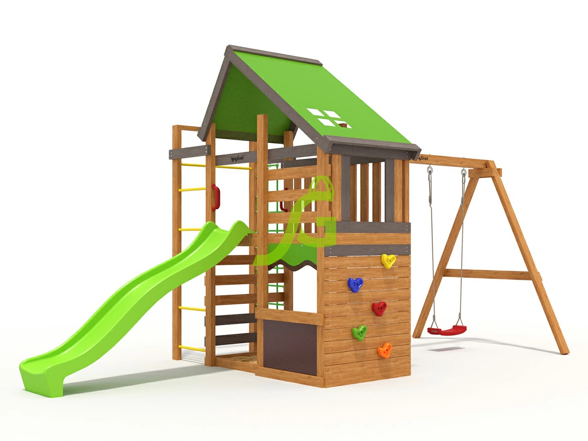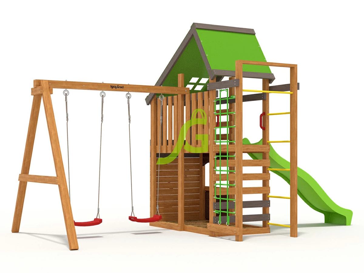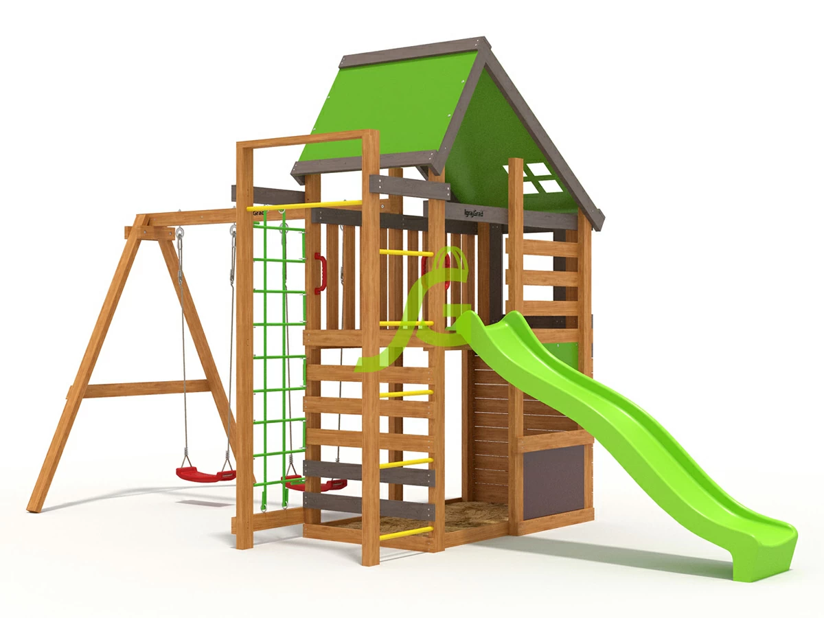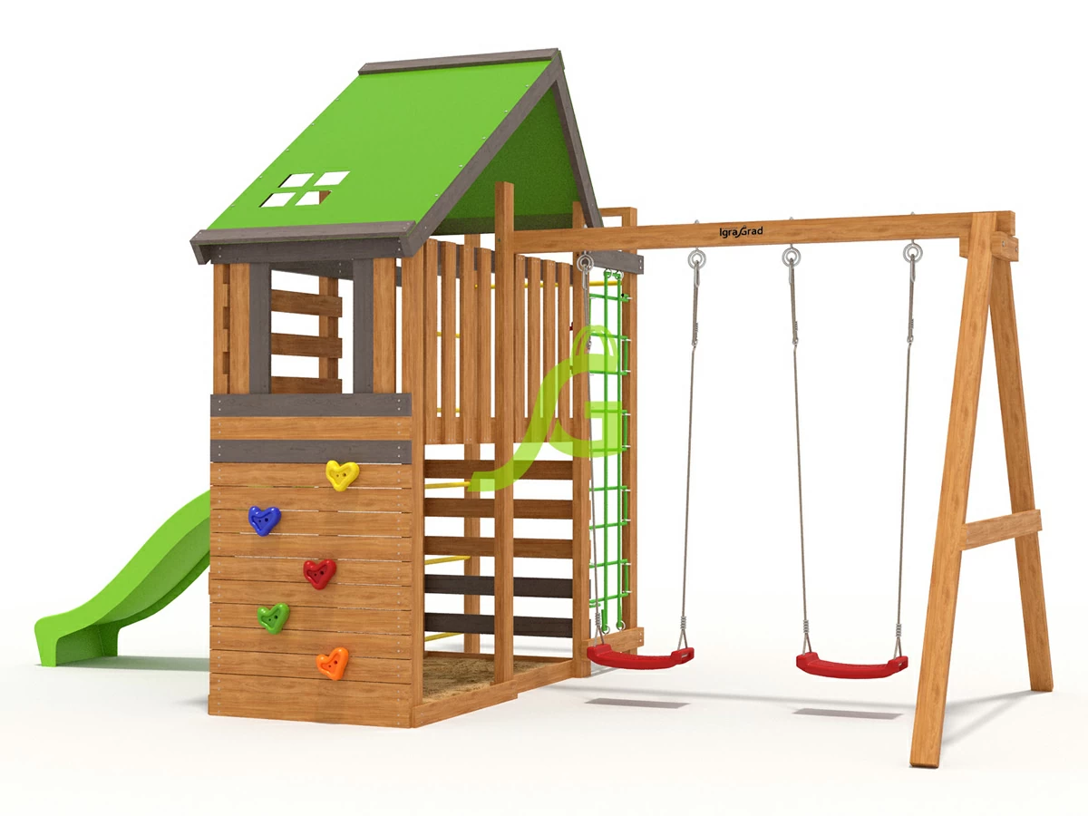 Игровая площадка IgraGrad W4 для детей представляет собой небольшой двухэтажный домик, который станет отличным местом для развлечения малышей. На первом этаже расположена песочница и импровизированный магазинчик, где можно «испечь» из песка вкусные «куличики» и тут же их «продать». Подняться на второй уровень можно по лестнице либо преодолев специальный скалодром. Спуск с яркой горки в виде волны принесет массу положительных эмоций и радости. Классические качели – именно то, что так необходимо каждому юному непоседе Основание площадки выполнено из бруса камерной сушки 45х90 мм.
