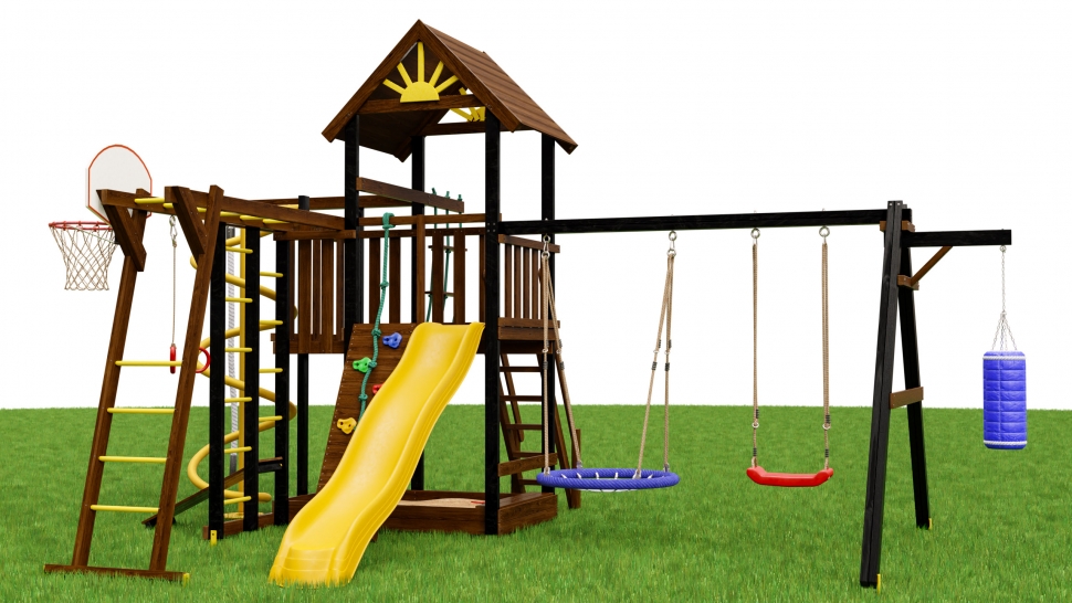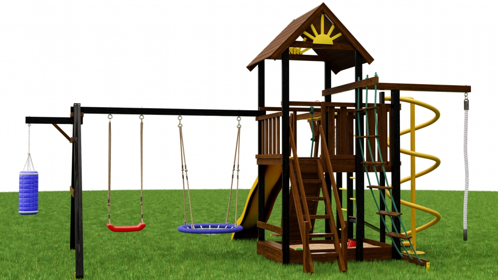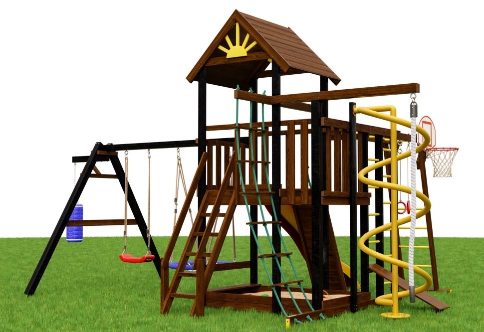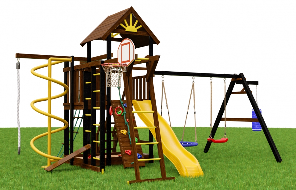 Качели, горка, спортивные снаряды и мтеллическая спираль— всё создано для активных и любознательных детей. Прочная конструкция из массива сосны прослужит долго, а благодаря обработке не боится капризов погоды.