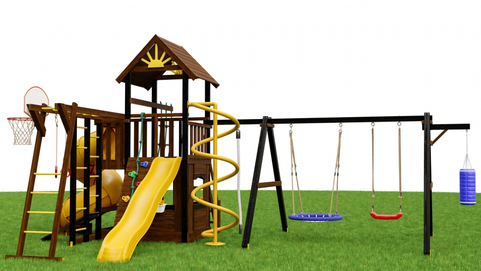 Качели «Гнездо» и прямые качели рассчитаны на серьёзную нагрузку. А баскетбольное кольцо — дополнительный стимул для командных игр всей семьёй.