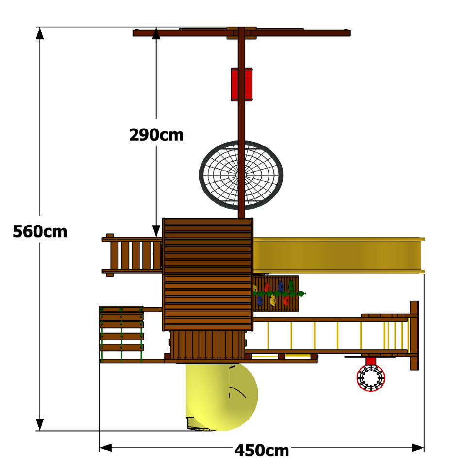 Уличный игровой комплекс оснащен «Шведской стенкой», веревочной лестницей, рукоходом, небольшим турником и стенкой для скалолазания с пластиковыми зацепами и надежным канатом.