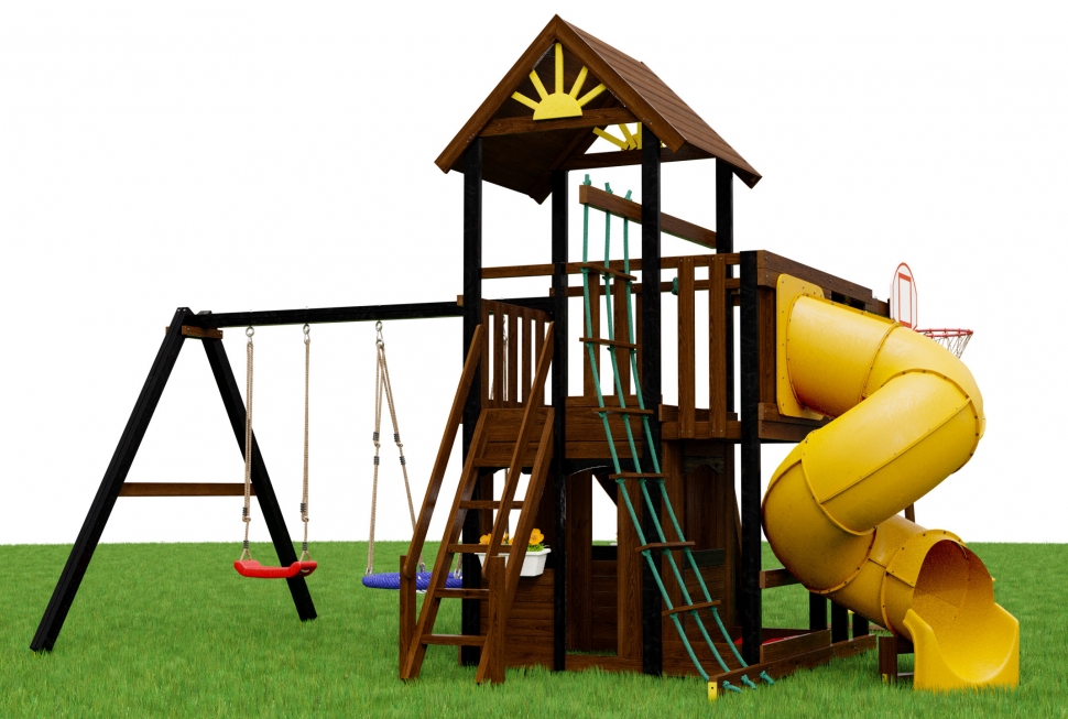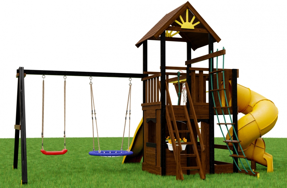 Изюминка площадки — двухъярусная крытая башня с 2-мя милыми домиками наверху и внизу. Последний дополнен цветниками.