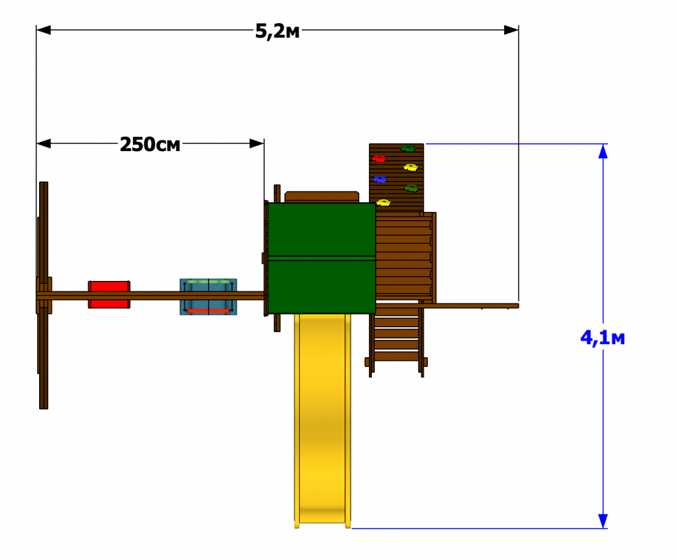 Комплекс дополнен качелями, одно из 2 сидений предназначено для детей до 3-х лет.