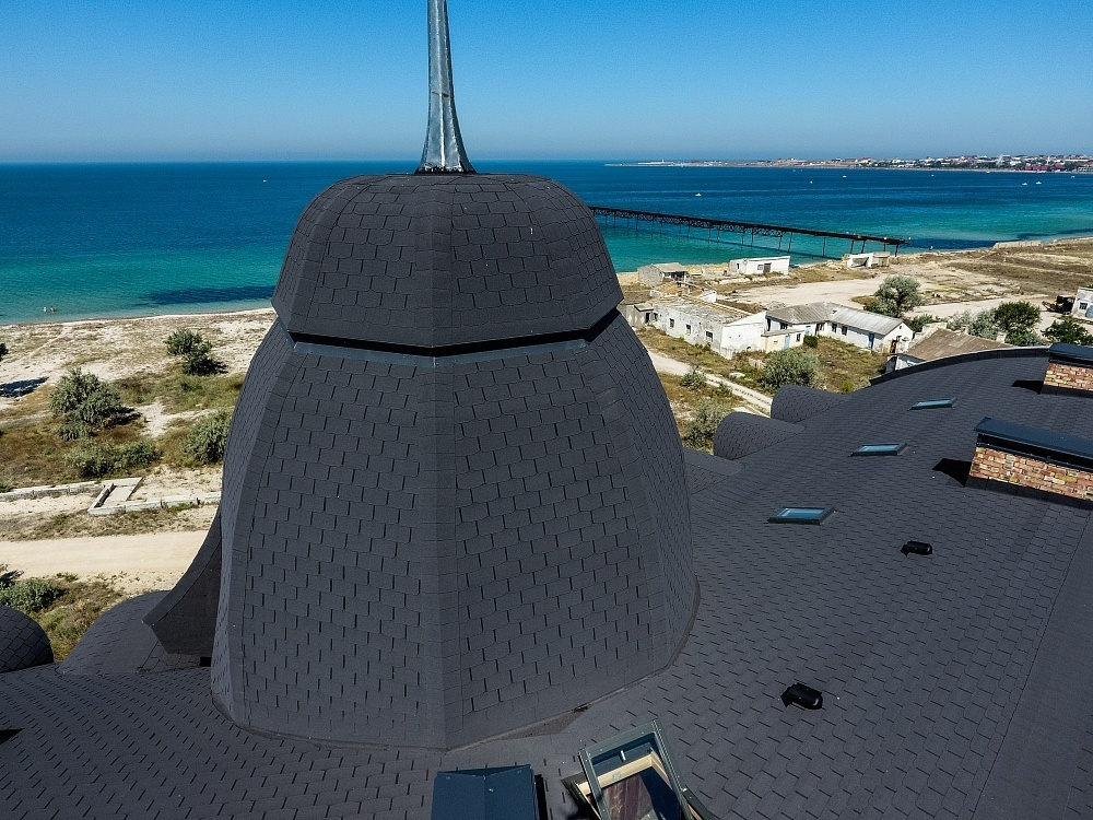 Гонты глубокого серого цвета с лепестками традиционной формы отлично подходят для оформления крыш сложной конфигурации. Черепица подчеркивает красоту деталей, при этом делает кровлю визуально более компактной. Она идеально сочетается с нейтральными светлыми оттенками и фасадами более насыщенных тонов.