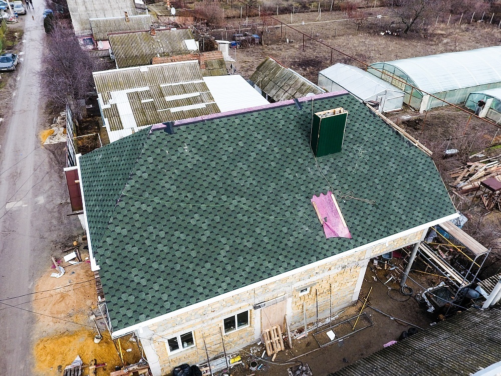 Максимально натуральный оттенок и лаконичная форма лепестков делают гибкую черепицу универсальным решением для однотонных и комбинированных фасадов. Темно-зеленая кровля хорошо сочетается с сайдингом светлых и теплых оттенков.