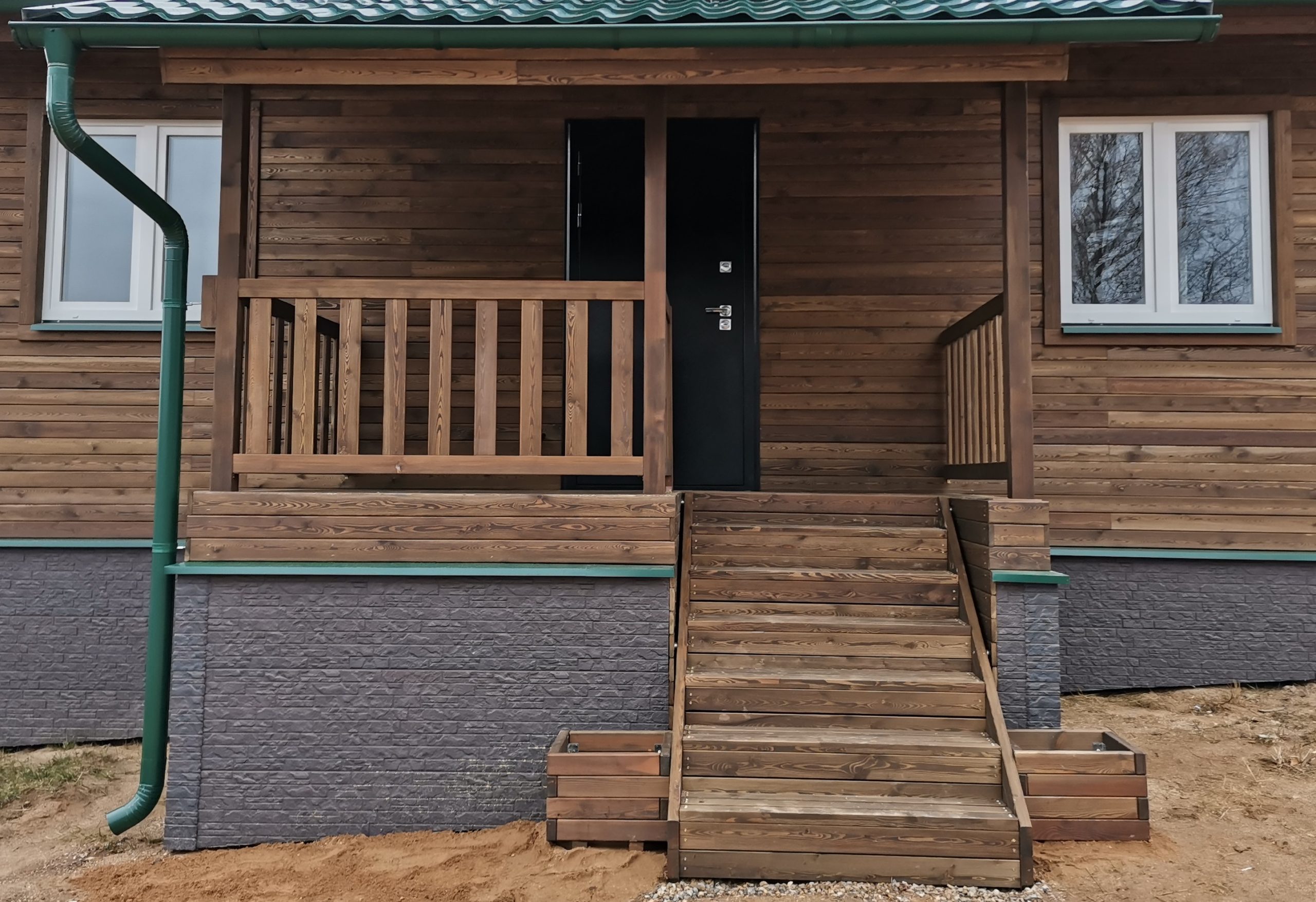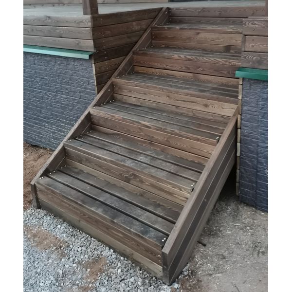 Комплектация. Каркас и ступени из клееного и сращенного бруса сечением 80х40мм., подступенки из планкена сечением 90х20мм. (камерная сушка, влажность 8-16%). Каждая деревянная деталь обработана в два слоя безопасным покрытием – восковой лазурью «ADLER» (цвет «орех»), торцы деталей дополнительно запечатаны мастикой.