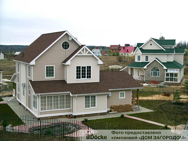 Корабельный брус «крем-брюле» легко комбинируется с сайдингом и аксессуарами как универсальных светлых, так и более насыщенных тонов. Чтобы внешний вид дома стал еще привлекательнее, достаточно использовать фактурные панели для цоколя и покрыть кровлю мягкой черепицей на 2-3 тона темнее.