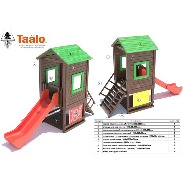 Основа конструкции – башня высотой 2,5м. В основании башни и на высоте 1м. в конструкцию встроены игровые платформы с ограждениями в виде декоративных панелей и ограничителями; с внешних сторон башни, в нижней части расположены пластиковые интерактивные панели для развивающих игр; сверху башни двускатная деревянная крыша. К платформе на высоте 1м. приставлены антивандальный пластиковый волнообразный скат с превосходной скользящей поверхностью и широкая деревянная лестница с перилами. Игровой комплекс предназначен для круглогодичного пользования, элементы конструкции устойчивы к воздействию окружающей среды (влажность, перепады температур, грибок, насекомые).