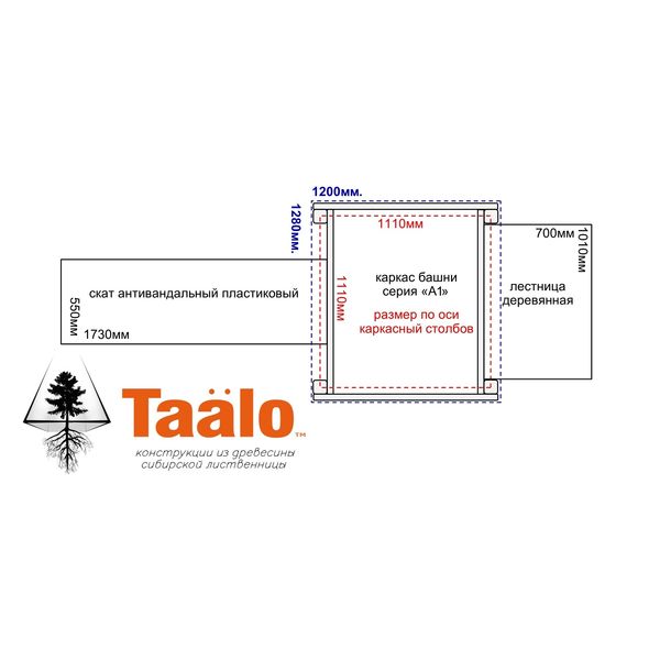 — каркас башни «серия А1» 1280х1200х2500мм. — 1ком. (брус лиственницы сечением 90х90мм. и 80х40мм., крепеж из оцинкованной стали);