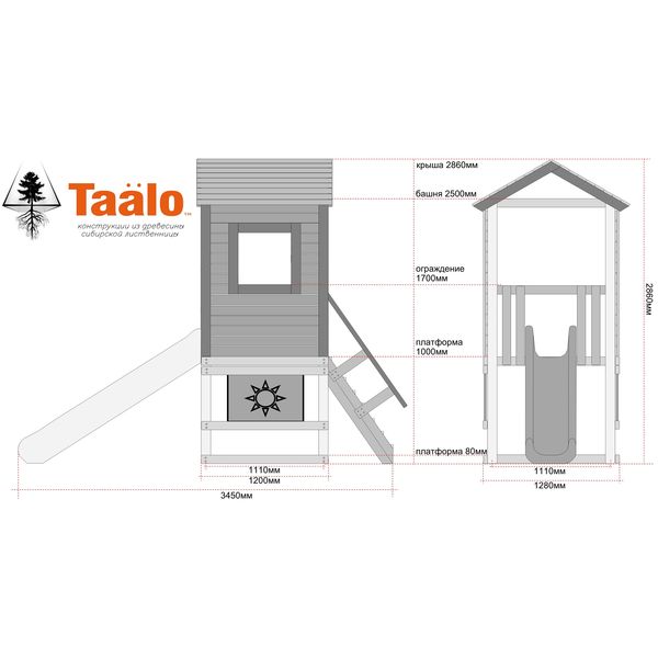 Максимальная высота от уровня поверхности игровой площадки до верхней отметки крыши 2860мм., высота каркаса основной башни 2500мм., высота игровых платформ 80мм. и 1000мм. (к верхней платформе крепятся скат и лестница), высота ограничителей 700мм., высота ограждений 1400мм.
