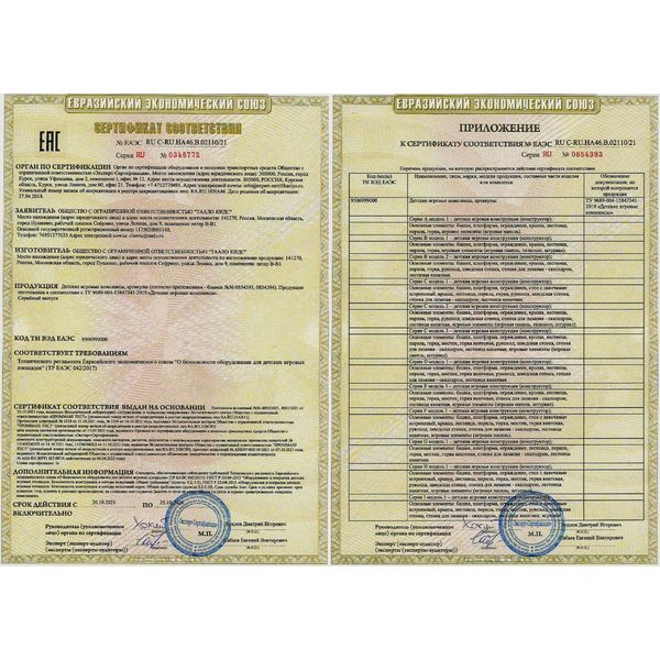 Сертификат соответствия ЕАЭС RU C-RU.HA46.B.02110/21 Детские игровые комплексы. 26.10.2021-25.10.2026г.