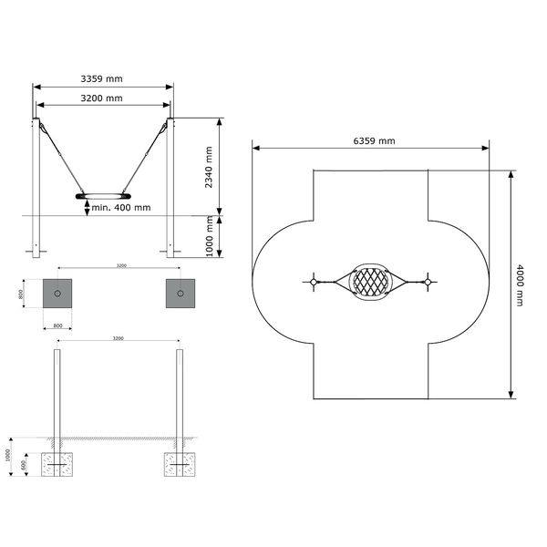 Комплектация: опорные столбы (необходимо бетонировать), круглое сидение ?1000мм из армированного каната, соединительные элементы.