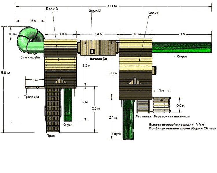 — качели: 2 стандартных, 2 поворотных колеса (360 градусов), трапеция с кольцами;