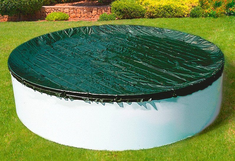 Тарпаулин плотностью 120 гр. на кв метр. Защитное покрывало (тент) для сборного бассейна – это водонепроницаемая пленка, по структуре напоминающая брезент. Покрывало одевается на борт бассейна и затягивается тросом с помощью стягивающего механизма.