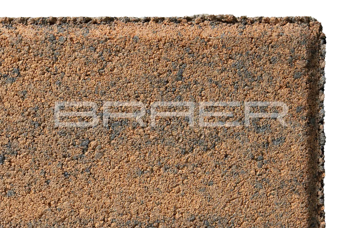 Тротуарная плитка BRAER состоит из 2 слоев: основного и лицевого. Технология двойного вибропрессования позволяет поэтапно уплотнить слои, что увеличивает прочность продукции. Основной слой содержит высокопрочный цемент и гранитный щебень, а лицевой (10% толщины) — мелкофракционный песок, белый цемент и пигменты.