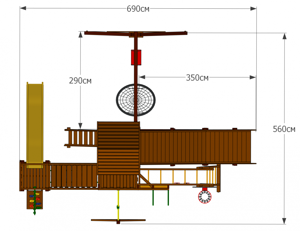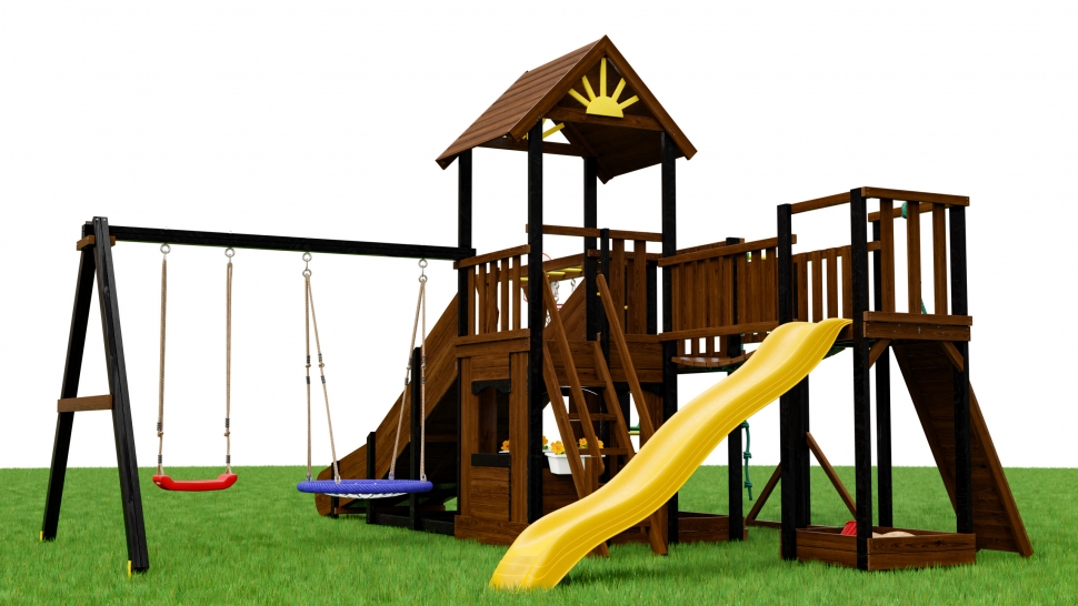 Игры на площадке научат ребенка не бояться высоты: с башни и подвесного мостика они будут наблюдать за происходящим вокруг. Занятия на спортивных модулях: шведской стенке, рукоходе, турнике, брусьях, кольцах, веревочной лестнице – это залог гармоничного физического развития и способ отвлечь от гаджетов. Несущие стойки площадки выполнены из массива сосны, качели — сборный брус 90х95мм.