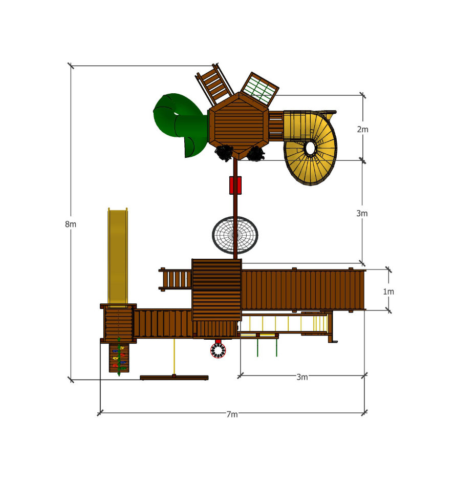 Спорт и игры для целой детской компании? Игровая площадка «Марк 8» спроектирована таким образом, что на ней не будет тесно даже нескольким детям. Она дополнена второй башней с песочницей на первом этаже и двумя винтовыми горками. Кроме развлекательных, в конструкции продуман комплекс спортивных модулей. Занятия на них помогут развить физические возможности ребенка, зародят любовь к спорту и активному времяпрепровождению, отвлекут от гаджетов.