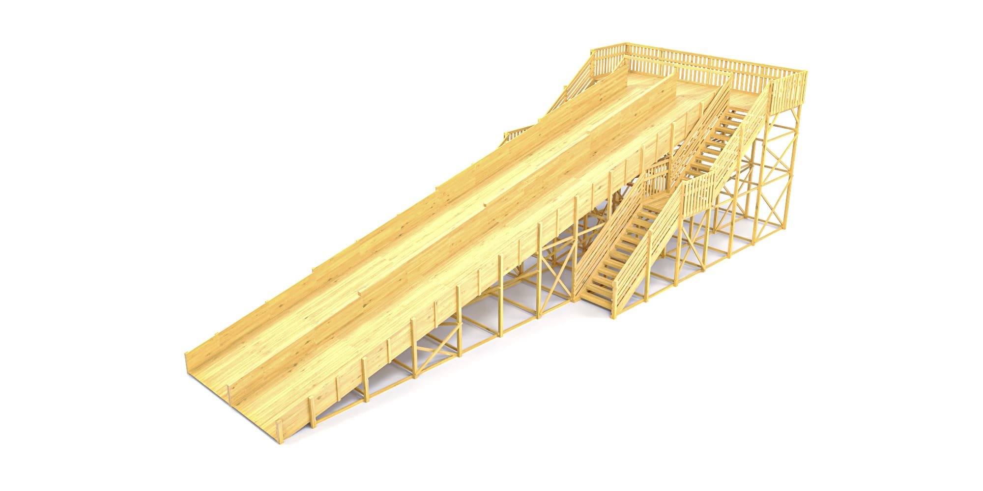 Два ската длиной 18 метров обеспечивают комфортное скольжение, а широкие ступени с антискользящим покрытием и высокие ограждения гарантируют безопасность детей.
